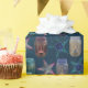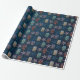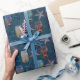 Um presente azul-estrelado, branco, envolto em decoração com jarras de pedreiro e estrelas com padrão boêmico.