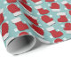 Papel de enrolamento com mitenes de Natal vermelhas e brancas e meias de Natal num fundo azul claro.