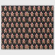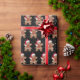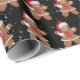 Biscoito de gengibre fofo vestindo um chapéu de Papai Noel em um fundo preto com padrão de flocos de neve.