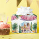 Uma ilustração ao estilo aquarela de uma jovem em um vestido de quinceañera ornamentado em frente a um prédio ao estilo colonial espanhol. O vestido é branco com uma saia de cheio dramática decorada com padrões florais cor-de-rosa ao longo da barra, apresentando um corpete rosa com capas de boné curto. Seu cabelo está estilizado em uma lua elegante com acessórios cor-de-rosa, e ela veste brincos cor-de-rosa. O fundo mostra um prédio amarelo e vermelho com portas arborizadas, torres domadas e detalhes arquitetônicos espanhóis. A paisagem inclui ciprestes altos, palmeiras e plantas do deserto. O céu é pintado com aquarela azul macia com nuvens sabedoras. A ilustração tem uma qualidade sonhadora e romântica com bordas suaves e transições de cores suaves. O chão mostra um caminho de pedra, e a paleta de cor geral consiste em amarelos, pintas, verdes e blues macios.