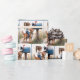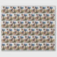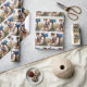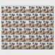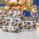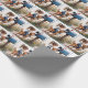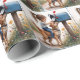 Sentada nas costas de um cachorro, uma garotinha se aproxima para colocar uma carta em uma caixa de correio azul cercada por flores silvestres vibrantes