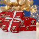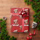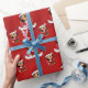 Papel de embrulho com ilustração de uma menina Latina/hispânica ou asiática, sorridente e feliz, de cabelo longo e preto, vestida de natal e vestindo um chapéu vermelho de Papai Noel e segurando um presente; design de Natal em fundo vermelho