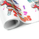 This wrapping paper design features a fun and vibrant Christmas theme. At the center, there is a cool, modern Santa Claus wearing sunglasses, sneakers, and a red outfit with colorful geometric patterns. Santa is striking a confident, dancing pose with one fist up and the other bent at his waist.