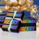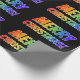 Esta divertida e colorida design de papel embrulhado no tema do Natal apresenta a mensagem "MERRY CHRISTMAS!", com letras com um padrão de gradação do espectro do arco-íris. O fundo é preto colorido.