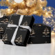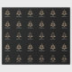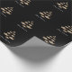 Papel de embrulho de Natal mostrado com oito Ouros brilhantes de quatro pontos em um impressão de layout de árvore de Natal festivo com uma pequena estrela colorida Champagne no topo. Feliz texto de Natal por baixo da coroa. Dourado, champanhe e branco apenas em fundo preto. Personalize este item ou comprar como está.