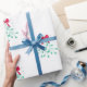 White background. Mistletoe with red bow Christmas wrapping paper.