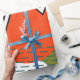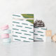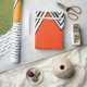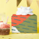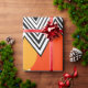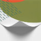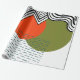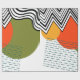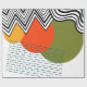 Este papel de embrulho tem uma design moderna do século médio de curvas e linhas ziguezagueadas em preto, círculos em amarelo, laranja e verde, e um retângulo feito de linhas rasas.