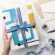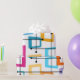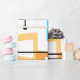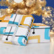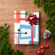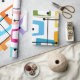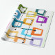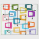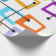 Este papel de embrulho tem um design de retângulos que são esticados em uma extremidade em tons ranhosos de laranja, verde, teal, roxo, azul, rosa e amarelo com linhas atômicas que os cruzam.