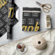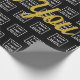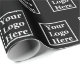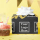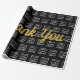 O texto grande de exibição diz 'Obrigado' no falso script dourado. (Se desejar, você pode editar o texto para mostrar uma mensagem personalizada.) Substitua o arquivo de logotipo de exibição pelo logotipo de sua empresa. Seu logotipo aparecerá em um padrão em papel de embrulho preto.