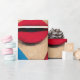 Uma mulher com cabelo vermelho e olhos azuis vibrantes cobrir seu rosto com as mãos luvadas. O fundo é brilhante com influências de pop.