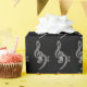 Um pedaço de música simples e elegante, a preto e branco, empacotou papel de embrulho - cordéis brancos e recifes de baixo contra um fundo preto texturizado. Amor à Música.