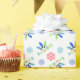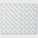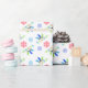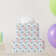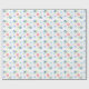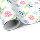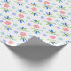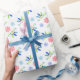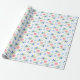 Papel de embrulho de Natal colorido com fundo branco e padrão festivo de flocos de neve e luzes de Natal, com texto gráfico que diz Merry and Bright, feito em verde claro, azul e vermelho.