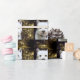 As montanhas ocidentais Terrier, ou Westie, poses na frente de uma parte externa iluminaram o papel de envolvimento do feriado do Natal dos amantes do cão da árvore de Natal