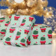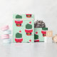 Papel de embrulho de Natal novinho com um padrão de cactos em roupas de Papai noel em fundo verde.