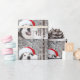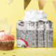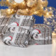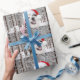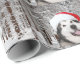 O cão preto e branco do Malamute do Alasca dons o papai noel chapéu e as cabeças para a neve perseguem o papel de envolvimento do feriado do Natal dos amantes