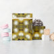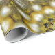 Um papel de embrulho de Natal ouro com um padrão caleidoscópio de ouro reluzente e bolhas de Natal prateadas formando um plástico elegante e decorativo.