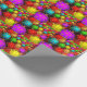 Papel de enrolamento de Natal com decorações brilhantes de árvores de Natal em cores brilhantes de amarelo, vermelho, verde, rosa e turquesa. Todos os elementos de design são impressos.