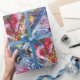 Pintura colorida, branca e artística em acrílico, Papais noeis estão tocando harpa à lua, coruja, ornamentos florais, plantas de inverno, brinquedos para crianças, bagas holly em cores vermelho vivo, verde, branco, azul, amarelo. por Búlgaro Lumini (c)