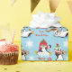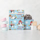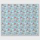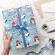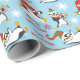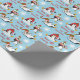 Três adoráveis pinguins brancos e pretos estão se divertindo no inverno neste lindo papel de embrulho de Natal. Um pinguim é bolas de neve fazer. Outro é carregando de uma bengala doce, verde e listrada vermelha, em forma de coração. Outra está deslizando sobre um pedaço de gelo. Todos os pinguins vestem bonés de estocagem de inverno muito coloridos. Alguns flocos de neve vermelhos ou brancos descem ao redor deles. Seu texto personalizado está vermelho, e tudo é colocado sobre um fundo azul gelado.