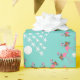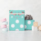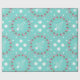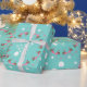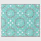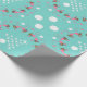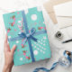 Papel de embrulho de Natal costeiro em um rolo. O plástico de presente de alta qualidade e pesado tem um design único com flamingos, dólares de areia e estrelas impressas em fundo verde de menta. As imagens das árvores de Natal são feitas de estrelas brancas com uma base de areia dólar. flamingos cor-de-rosa vestindo mortes festivas de férias circundam árvores brancas de estrelas-do-mar com base em dólares de areia.