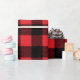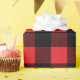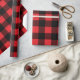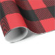 Esta design de papel de embrulho de Natal apresenta uma moderna e rustica casa de fazenda, um fundo vermelho brilhante e xadrez de búfalos pretos com padrões em larga escala.