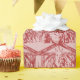 Um design vermelho estampado, com Maria, José e Baby Jesus na mangueira debaixo de uma estrela brilhante contra um fundo vermelho texturizado.