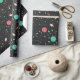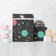 Planetas astronômicos, cometas e estrelas a preto com foguetes.