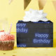 Sinal de aniversário feliz de Neon azul no padrão de tijolos de cinzas escuras.