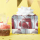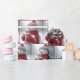 Um bonitão vestido de chapéu vermelho, cachecol e luvas segura uma caneca de chocolate quente tocada com marshmallows