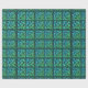Um pedaço de papel de embrulho de um design de nó celta azul-esverdeado contra um fundo preto.