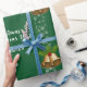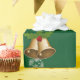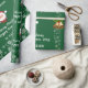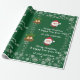 Papel de embrulho de Natal moderno, elegante e fofo, com um desenho de Santa Cláusula em seu chapéu e fantasia vermelhos, o texto "Feliz Natal e Feliz ano novo 20XX" em letra de na moda / caligrafia, e um nome personalizado. Com borrifas de flocos de neve brancos e prateados, e dois pares de sinos de Natal ouro com um cintilante de holly, sobre um fundo verde de Natal. Certifique-se de personalizar o nome e o ano.