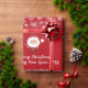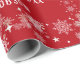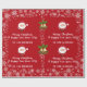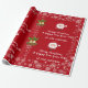 Papel de embrulho de Natal moderno, elegante e fofo, com um desenho de Santa Cláusula em seu chapéu e fantasia vermelhos, o texto "Feliz Natal e Feliz ano novo 20XX" em letra de na moda / caligrafia, e um nome personalizado. Com borrifas de flocos de neve brancos e prateados, e dois pares de sinos de Natal ouro com um cintilante de holly, sobre um fundo vermelho de Natal. Certifique-se de personalizar o nome e o ano.