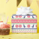 The repeated pattern on this colorful Christmas Nordic sweater style gift wrapping paper is a silhouette basketball player among snowflakes , trees, and geometric designs. Colors include navy blue, bright Holiday green, and red, all on a white background. Fun for anyone who loves to play basketball!