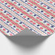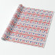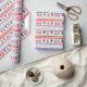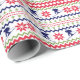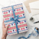The repeated pattern on this colorful Christmas Nordic sweater style gift wrapping paper is a silhouette downhill snow skier among snowflakes , trees, and geometric designs. Colors include navy blue, bright Holiday green, and red, all on a white background. Fun for anyone who loves to snow ski!