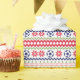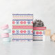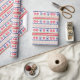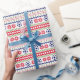 The repeated pattern on this colorful Christmas Nordic sweater style gift wrapping paper is a silhouette soccer ball among snowflakes , trees, and geometric designs. Colors include navy blue, bright Holiday green, and red, all on a white background. Fun for anyone who loves to play soccer!