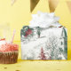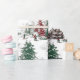 Nostalgic red and green Christmas gift wrap featuring a vintage holiday village with snow-covered houses, evergreen trees, and people gathering near the church. Illustrated in classic toile style, this design brings warm, old-fashioned charm to Christmas wrapping and seasonal gift presentation.