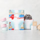 Papel de envolvimento do aniversário que caracteriza pouco barco de madeira com vela e bandeira em um dia ventoso no mar em azul e em vermelho. Personalize este papel do aniversário dos meninos lunáticos quarto com seus nome e idade. Lê atualmente Connor 4 hoje. Pintado excepcionalmente na aguarela e projetado por Sarah Trett.