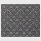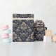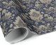 This elegant wrapping paper features a luxurious navy blue background adorned with intricate gold and cream floral motifs, creating a sophisticated baroque style. The symmetrical layout showcases large stylized flowers surrounded by smaller buds and leaves, offering a richly decorated appearance that exudes timeless elegance. Perfect for special occasions, this design captures an opulent mood, making it ideal for gifting and celebrations where a touch of classic luxury is desired.