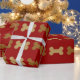 Papel de embrulho de presente de Natal bonito para cães ou seres humanos com osso de cão trata o padrão sobre fundo vermelho festivo.