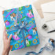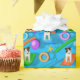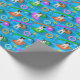 Este belo papel de embrulho de presente de piscina para cães para amantes de Parson / Jack Russell Terrier apresenta um padrão de quatro diferentes JRT/PRTs com marcas variadas de cabeça/corpo castanho e preto e uma charmosa cabeça de cão inclinada sobre os seus colorido tapetes flutuantes azuis, cor-de-rosa, laranja e piscina com uma bola tênis em uma clara piscina azul macarrão e bolas e brinquedos de mastigação flutuantes em forma de peixe-estrela amarelo - Parte / Jack Russell piscina © katz_d_zynes 2021