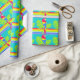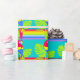 Papel de embrulho gráfico colorido e a negrito, com padrão repetido de uma simples arte gráfica de papagaio-de-arara tropical num fundo listrado do arco-íris. Arte e design por Sarah Trett.