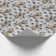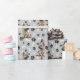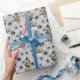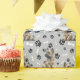 Uma imagem de um adorável Cairn Terrier Dog é a característica do padrão neste papel de embrulho de presente de ocasião. O cachorro se senta em meio a um padrão de estampas pretas e ossos brancos, e se repete em um fundo de cinza clara.