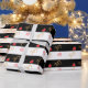 Padrão cardíaco de alegria festiva sobre fundo branco e preto listrado Papel de enrolamento de presente.