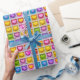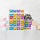 Padrão de repetição de arte digital / papel de parede / impressão de azulejos de coração quadrado fofo. Eles têm aparência 3d e têm branco entre os azulejos roxo, verde, amarelo, azul e rosa.