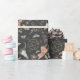 O papel de embrulho Spooky Halloween apresenta um padrão de planchettes, mãos, crânios, pentagramas, mariposas e flores escuras sobre fundo preto de cinza.