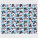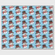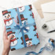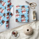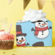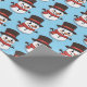 Um papel de embrulho de neve de Natal com um desenho animado de um adorável boneco de neve vestindo um chapéu e um cachecol vermelho. Ele tem uma cenoura para um nariz carvão para olhos e botões, galhos para braços e um sorriso grande e feliz. Este doce padrão de feriado está num fundo azul pálido.