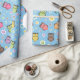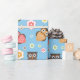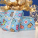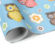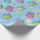 Um padrão perfeito e colorido que apresenta corujas de desenho animado em várias cores brilhantes, como rosa, laranja, verde, marrom e azul. As corujas estão cercadas por uma mistura de flores pequenas e multicoloridas sobre um fundo azul macio, criando um design alegre e balbucioso. Perfeito para produtos para crianças.