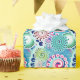 Padrão de espiral frontal em tons de azul, rosa, verde e turquesa, acentuado com branco