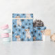 Uma imagem de um cão Terrier Jack Russell é o destaque no padrão deste papel de embrulho para todas as ocasiões. O cão senta-se em meio a um padrão de impressões de patas pretas e ossos brancos, e é repetido em um fundo azul médio.