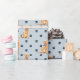 Uma imagem de um Cachorro do Retriever de Ouro é a característica do padrão neste papel de embalagem de presente de ocasião inteira. O cachorro veste uma gravata arco azul em meio a um padrão de estampas pretas, e é repetido em um fundo de cinza prateada.